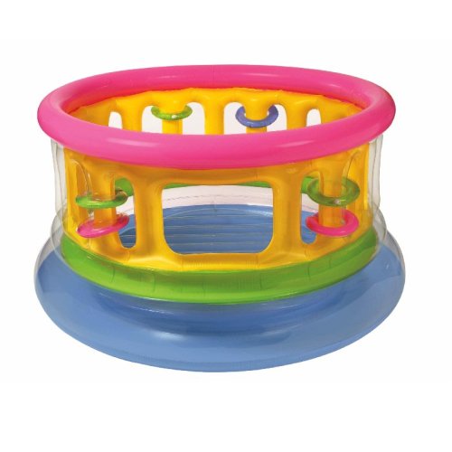 Intex Jump-O-Lene Indoor Toddlers Bouncer Playhouse | Inflatable Trampoline | ***** New Model Year 2008 Improved Design & Color ***** You'll jump for joy when you see how much fun your kids are having with this affordable, inflatable jumping station for children. The added safety of its air- filled, see-through walls and enhanced durability make this an ideal addition to any backyard or playroom. Portable enough to take along on play dates and vacations. Save the bed for sleeping and the sofa for sitting! As much fun as a trampoline with added safety and easy portability. 6 Inflatable, Colorful Toss Rings including 2 with rattlers inside for added fun and games. Crawl-Through Doorway provides easy access that also lets kids use the Jump-N-Gym as a unique, cushioned playhouse. 71.5-inch-diameter Jumping Base. Big enough for 2 kids to jump and enjoy together (maximum weight limit: 120 pounds, 60 lbs max. each). 40-inch-high Translucent, Inflatable Walls for added safety and a convenient place to hang included toss rings. High-Molecular, PVC Construction offers superior resistance to damage from abrasion, impact and sunlight. Ideal for indoor use on rainy days, the Jump-O-Gym may be inflated using an ordinary hand pump. For even faster results, we recommend an electric air pump (not included). Ages 3 - 6 years. ***** Caution: using household air compressors to inflate WILL CAUSE DAMAGES to unit ***** : Inflatable Trampoline